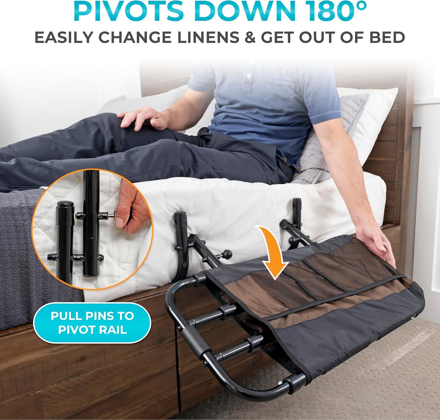 Absolutely. The safety rail is specifically built to reduce fall risk and provides a solid support handle for both entering and exiting bed. - Can the organizer pouch be removed?