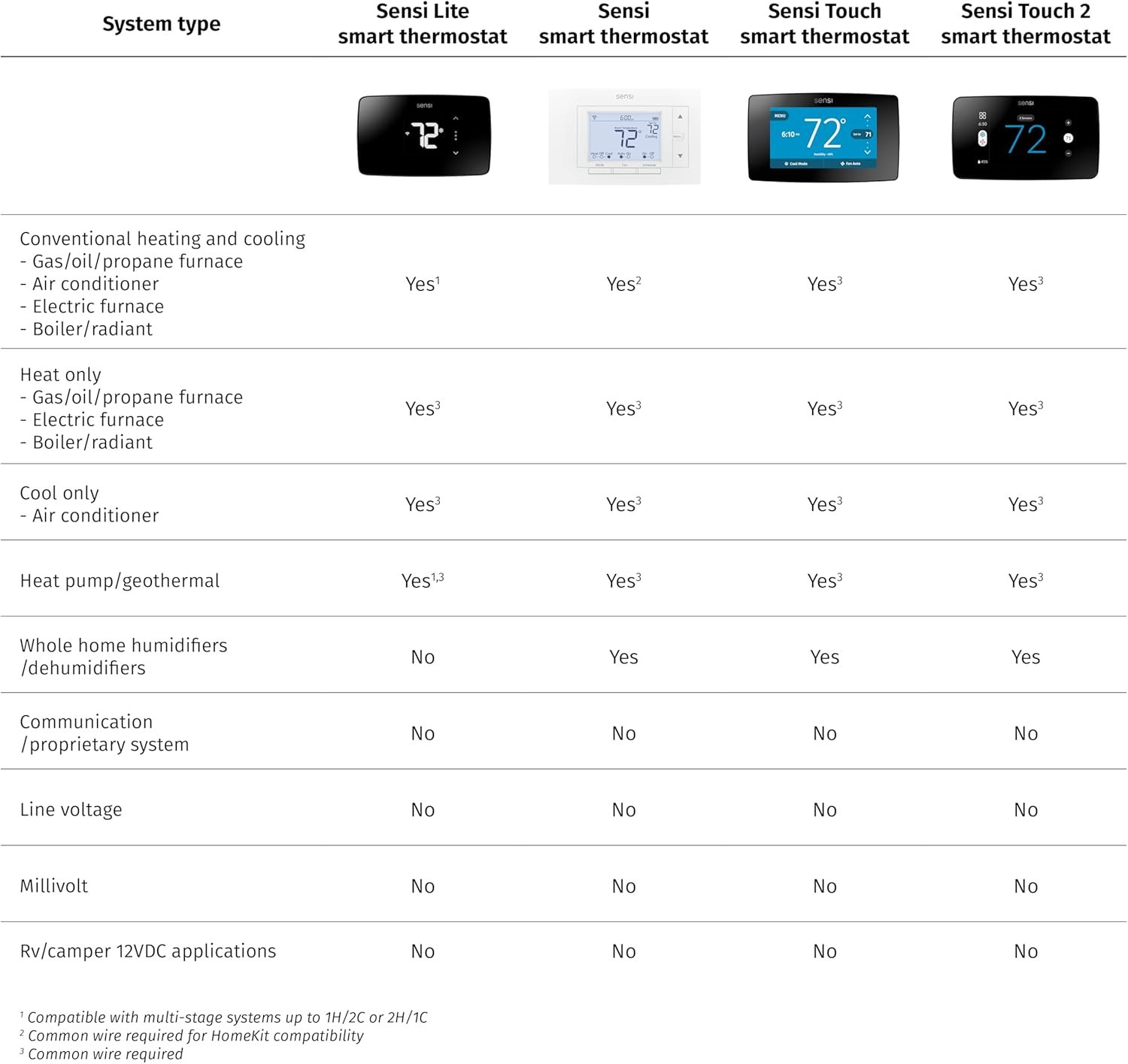Most 24V forced air, steam, hot water, and heat pump compatible systems work with this model, except electric baseboard. Always check C-wire compatibility before purchasing. - How does the smart thermostat compare to premium models?